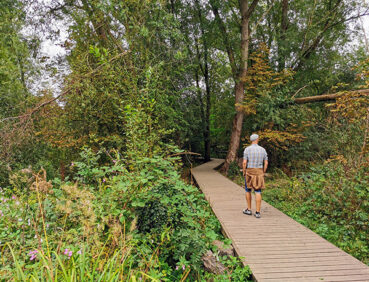 The overall route is very level, with no steep gradients encountered. While most of the paths used are wide and well-made, they can be uneven and potholed in places. Mud and puddles are likely on certain sections. The ‘Detours and trail updates’ section below also describes some diversions and an exit route in the event of flooding.